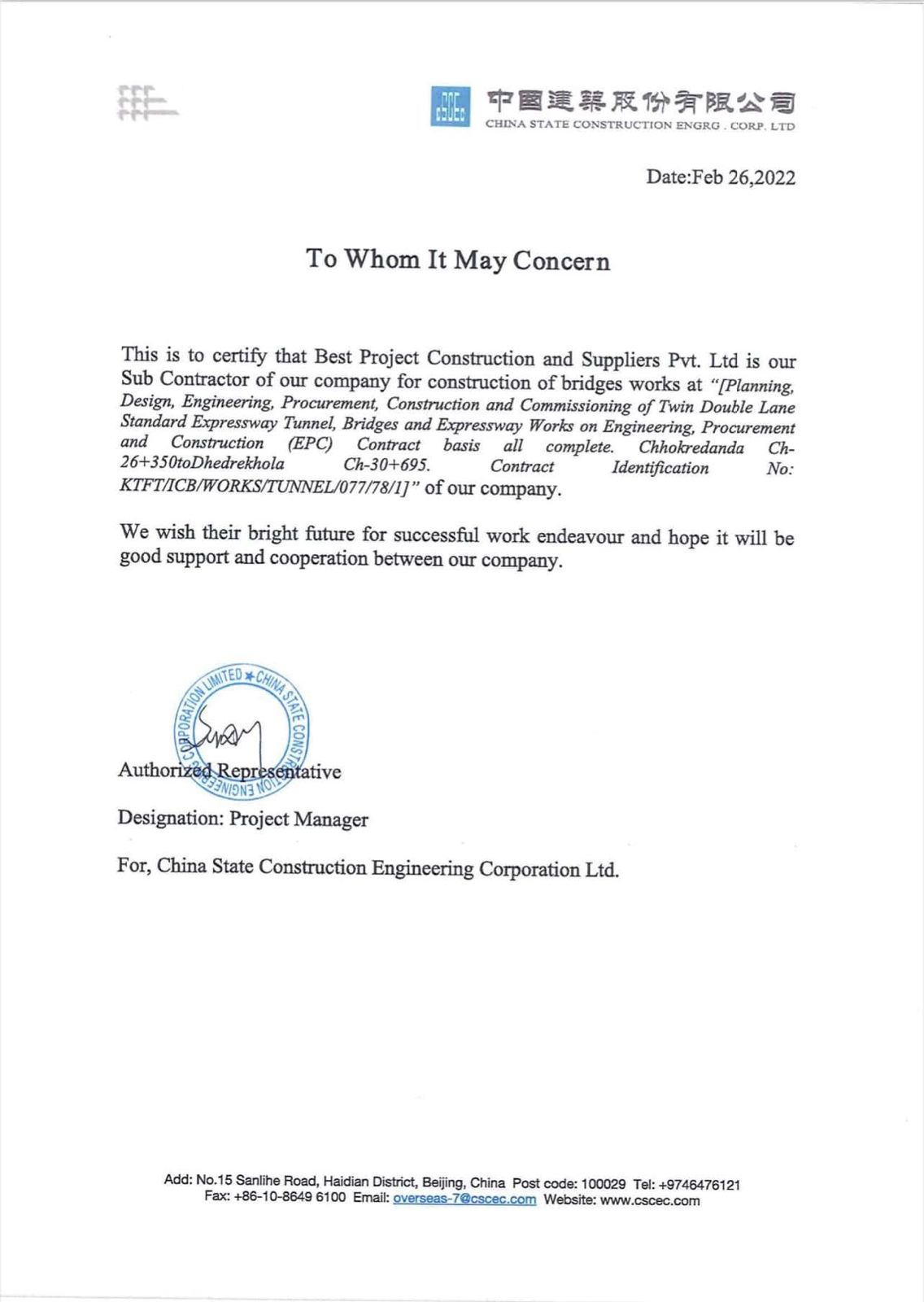 Best Project Construction & Suppliers Pvt. Ltd. is a construction and supply chain management based company. It has highly experienced and dedicated team in the field of construction and supply chain management. Its area of construction lies on mega project and so on and supply of the construction materials, equipment, logistic and experienced human resource for various projects. It provides entire solution to the projects. We are committed for providing the shape of your expectation.